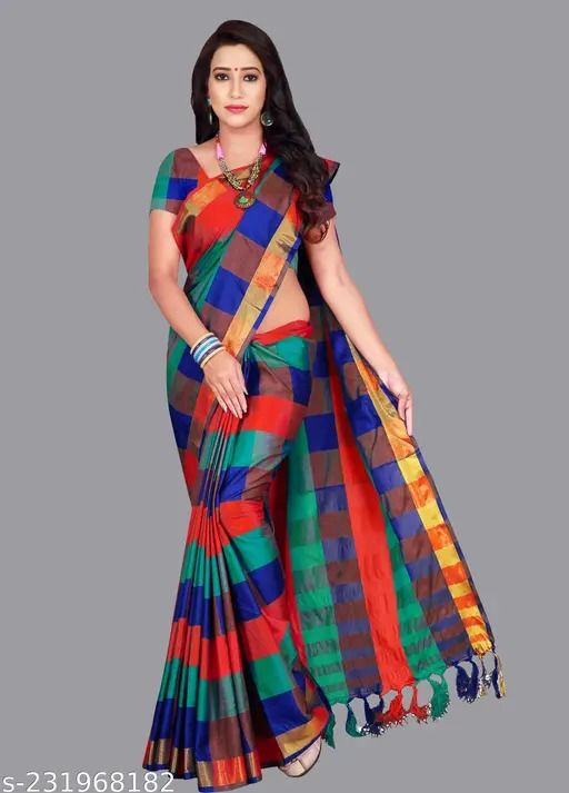 Green Blue Red Checked Cotton Slub Uppada Saree With Blouse Piece